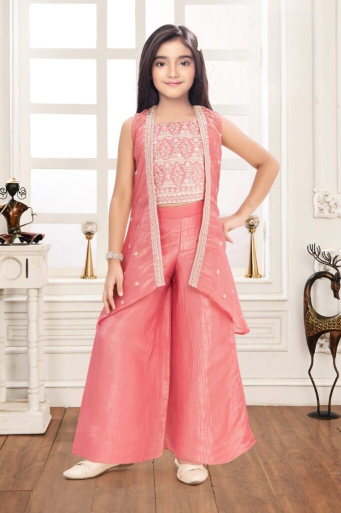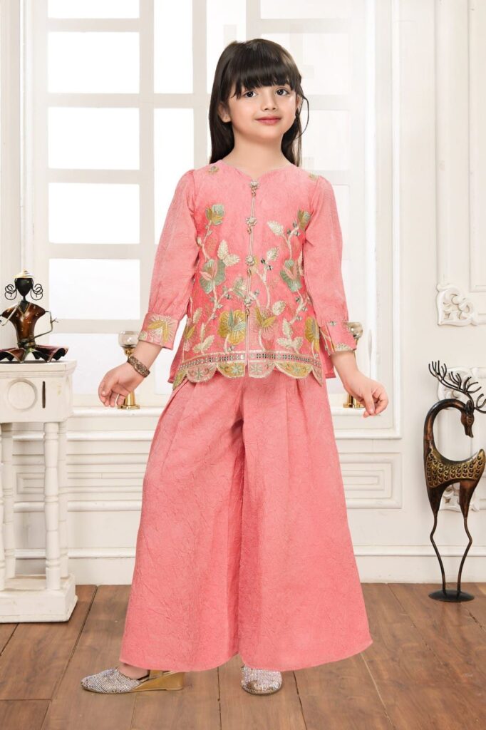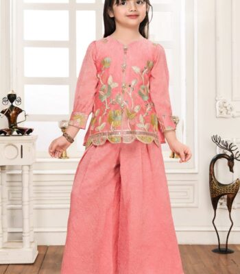 ₹1,305 – ₹1,455Price range: ₹1,305 through ₹1,455Chic Pink Jacquard Palazzo Suit for Girls | Full Sleeves Embroidered Peplum Top