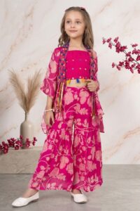 : Girls’ Rani Pink Floral Printed 3-Piece Sharara Set with Shrug and Embroidered Crop Top