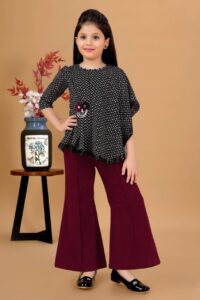 Girls’ Black Printed Asymmetric Poncho Top and Maroon Corduroy Bell-Bottom Pant Set
