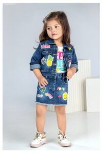 Girls’ 3-Piece Patch Denim Set: Jacket, Graphic Tee & Fringed Skirt