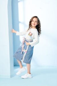 Girls’ White Long Sleeve Applique Top & Denim Midi Skirt 2-Piece Set