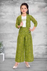 Girls’ Olive Green Floral Printed Three-Piece Jacket and Wide-Leg Pant Set with White T-shirt