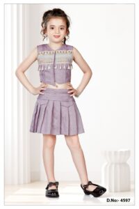 Girls’ Mauve Textured Sleeveless Crop Top and Pleated Skirt Set with Tassels and Embroidery