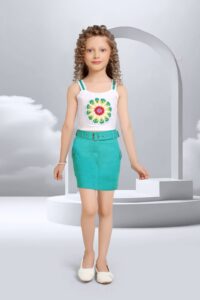 Girls’ White Embroidered Crop Top and Teal Skirt Set with Matching Belt