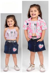 Girls’ 3pc Set: Pink & Blue Stripe ‘Shine’ Top, Printed Shrug, and Denim Skirt