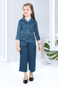 Girls’ Teal Metallic Textured Belted Top and Wide-Leg Pant Set