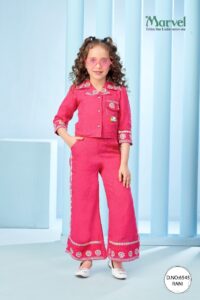 Girls’ Hot Pink Pant Suit Set with Floral Embroidery and Wide-Leg Pants
