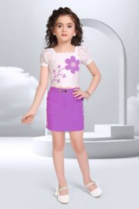 Purple Mini Skirt and White Scalloped Crop Top with Purple Flower Embroidery