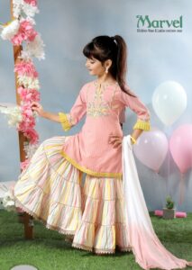 Girls’ Pure Cotton Peach Embroidered Kurti & Striped Tiered Sharara Set | Kids’ Summer Ethnic Suit