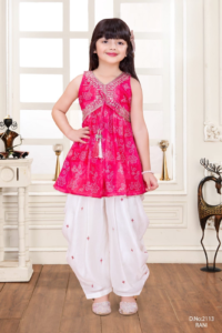 Girls’ Rani Pink Printed Peplum Top & White Dhoti Set | Kids’ Festive Indo-Western Suit