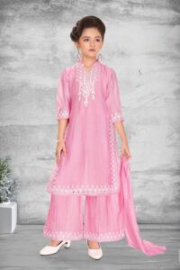 Girls’ Pink Embroidered Tussar Silk Sharara Set with Scalloped Hem