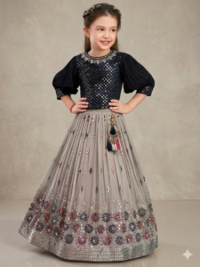 Girls’ Navy Blue Sequin Choli and Grey Pleated Lehenga Set