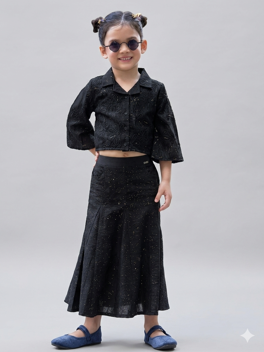 Give your little fashionista a moment to shine with this meticulously crafted all-black coordinated outfit set. Designed for the confident, modern girl, this set transitions effortlessly from dressy luncheons to special evening events. It’s a stylish statement piece that blends sophisticated details with a comfortable, wearable silhouette.