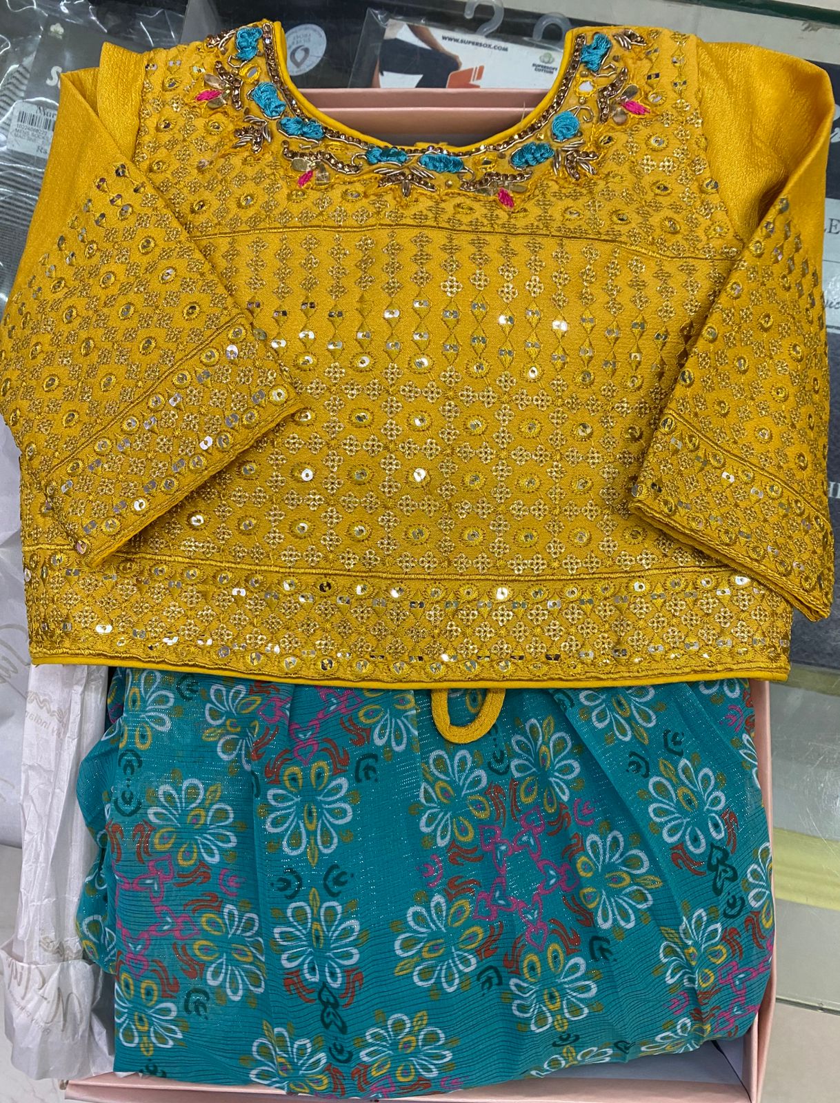 Girls’ Mustard Yellow Embroidered Choli and Teal Blue Pleated Lehenga Set