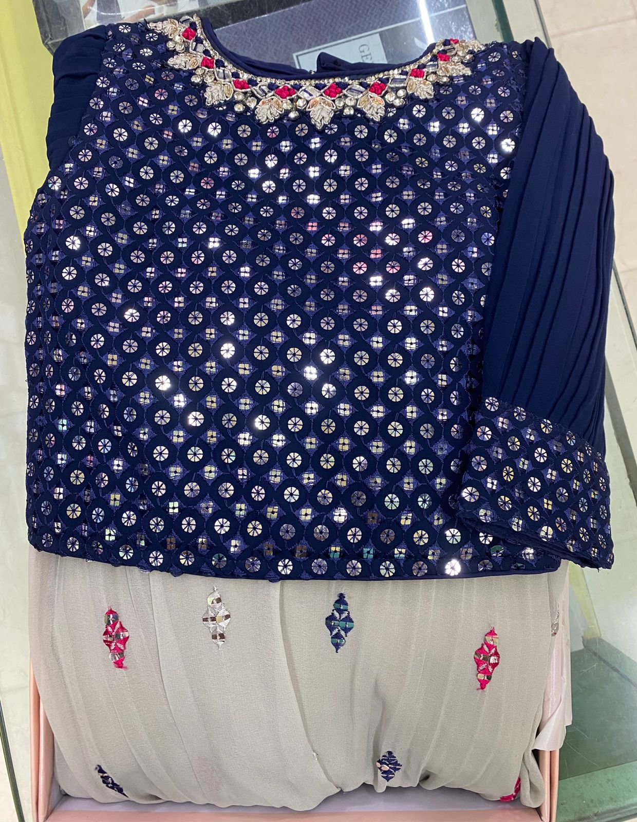 The Choli (Blouse): A chic Navy Blue blouse designed with fashionable balloon sleeves that are gathered at the cuff. The defining feature is the spectacular mirror-effect sequin pattern that mimics the shimmer of traditional mirror work, creating a luxurious texture that glows under lights. The unique design has intricate multi-color sequin and thread embroidery along the neckline and cuffs.