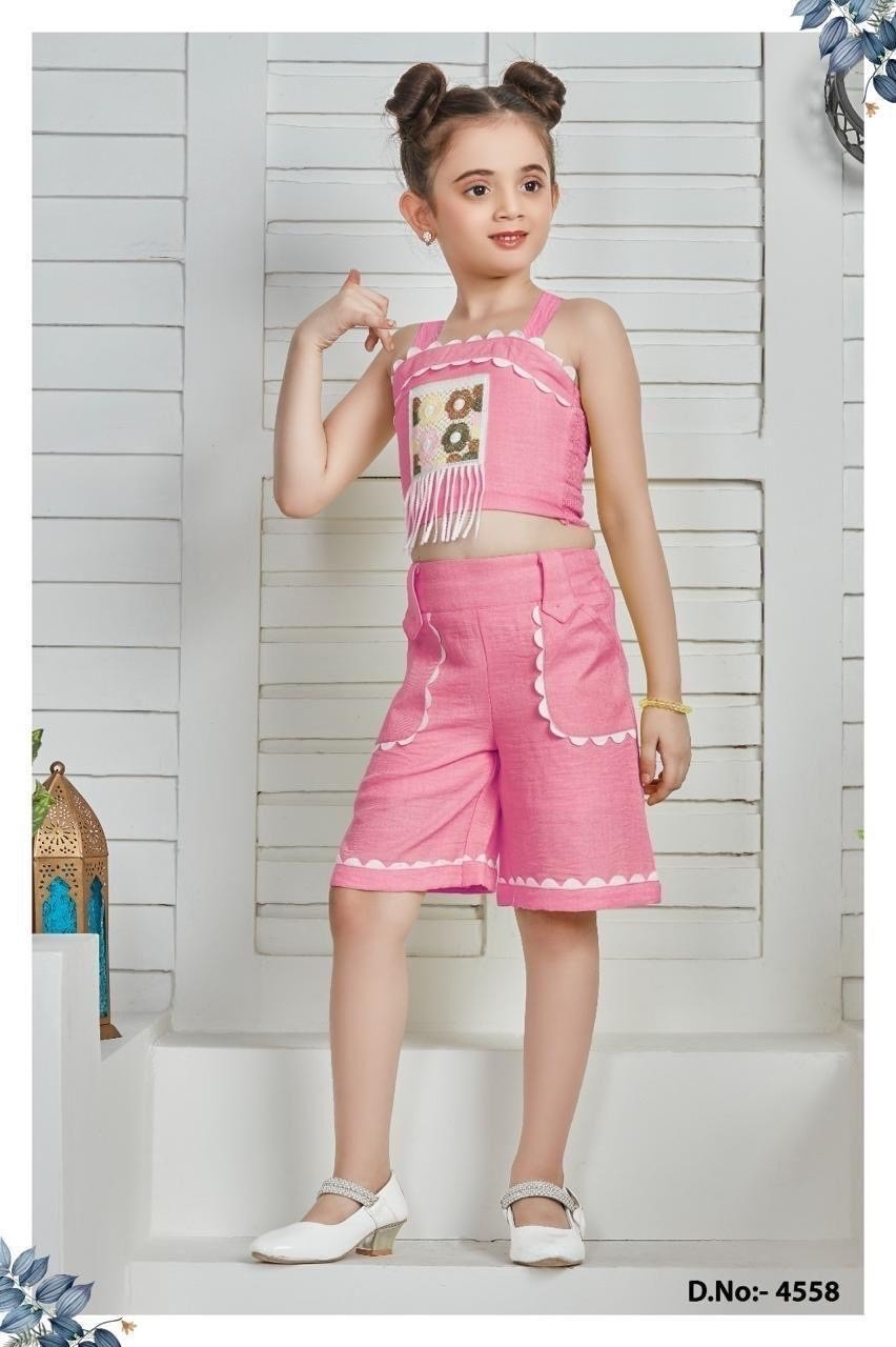 Be the first to review “Girls’ Pink Textured Cotton Crop Top and Culotte Shorts Set with Scallop Trim”