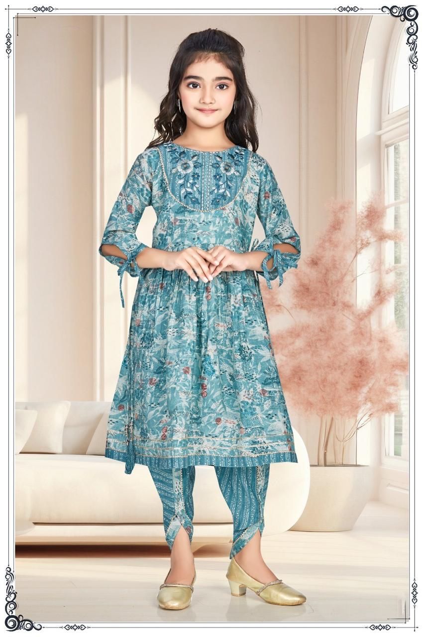 Girls’ Sea Green Floral Embroidered Tunic and Tulip Pant Set – Dhoti Style