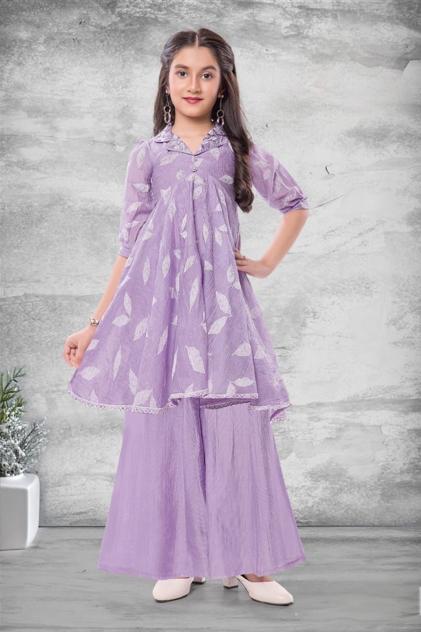 The Sharara (Bottoms): Coordinated perfectly in the same crinkled lavender fabric, these bottoms complete the monochromatic look. The Sharara style provides a clean, wide-leg flared silhouette that allows for easy movement and a regal look, ensuring both comfort and high-fashion flair.