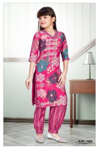 Girls’ Rani Pink Floral Print Kurta and Zig-Zag Pattern Salwar Set